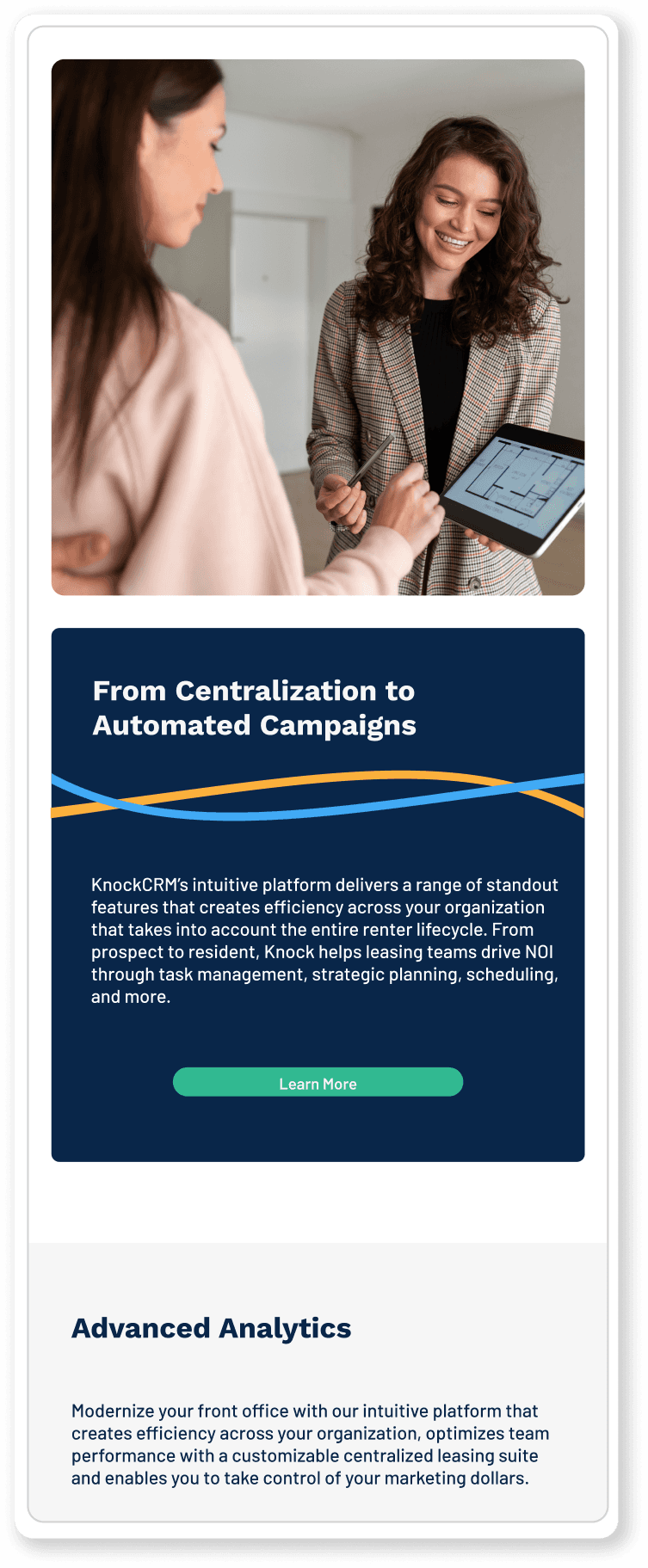 Our next steps included implementation across our marketing efforts, integrating brand elements of imagery, color, and design guidelines across our Centralized Leasing Suite campaign which included emails, landing pages, digital ads, and social media.