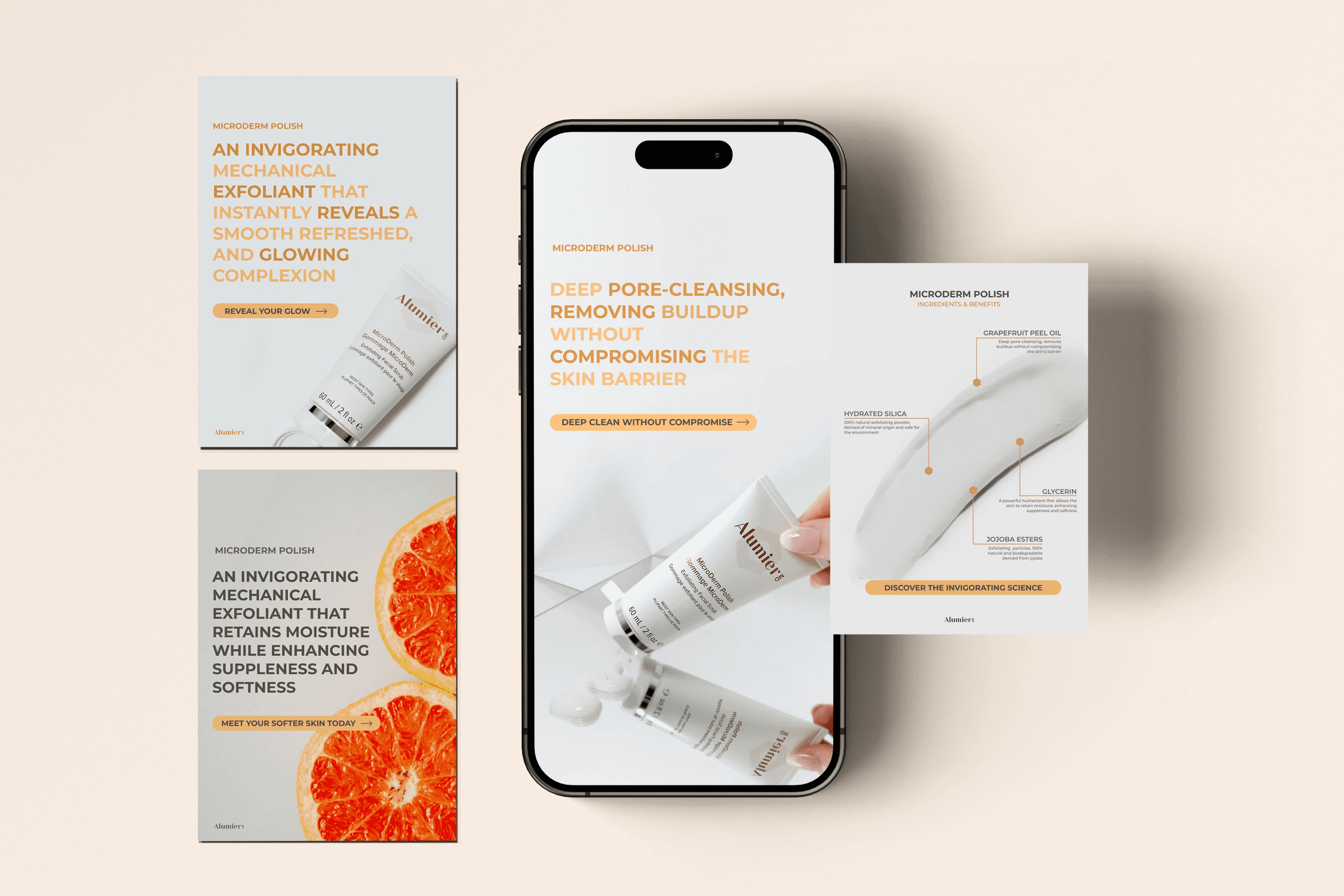 Through Microderm Polish's key ingredient, grapefruit peel oil, the campaign persona took on visual elements that evoked a soft, gentle, and refreshing feelings that coincided with citrus and an exfoliating product. New colors, typography, and imagery styles were incorporated to demonstrate this visual goal and capture audience engagement.