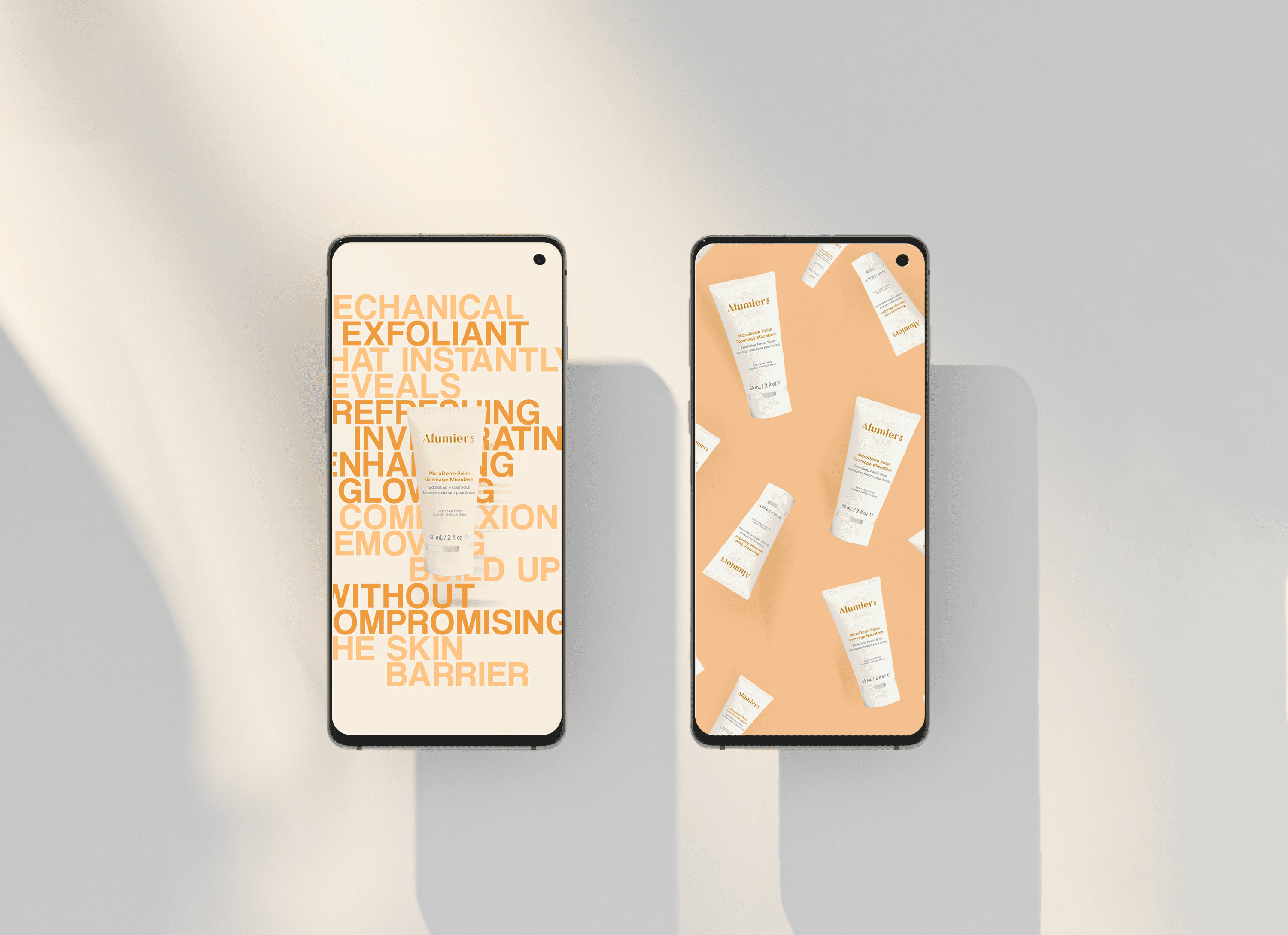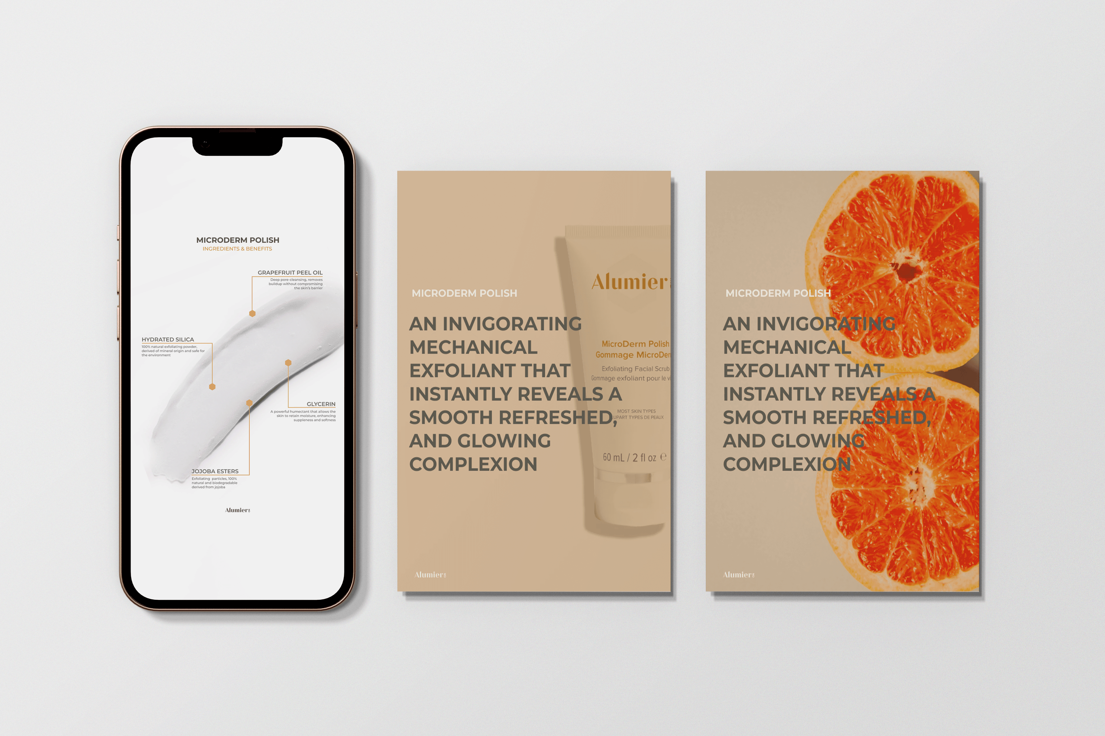 MicroDerm Polish was born on it's main ingredients of hydrated silica and grapefruit peel oil, to help uncover a smooth complexion while refreshing the skin. Through a comprehensive sales and content strategy, MicroDerm Polish's introduction to the AlumierMD product line focused on a launch centering the concepts of refreshing, hydrating, and moisturizing experience. Visual content took on a strategic, editorial approach, incorporating new colors, typography, and imagery styles, while honoring the brand story and mission on education.