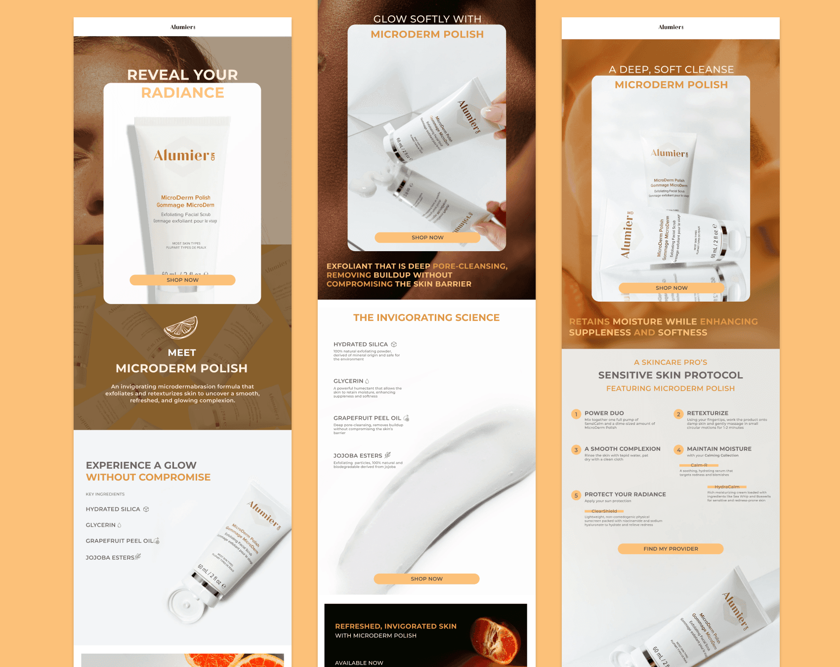 Crafted B2B and B2C email marketing campaigns, including launch and product education. Partners received step-by-step skincare protocols ls to support their patients and exclusive order deals, while consumers discovered the product benefits and the opportunity to purchase through a medical professional provider.